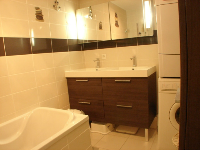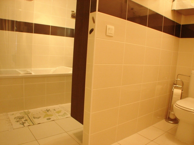 Sur votre droite, la salle de bain avec WC. Entièrement carrelée, dans les tons crème et chocolat, celle-ci est très jolie et agréable.
