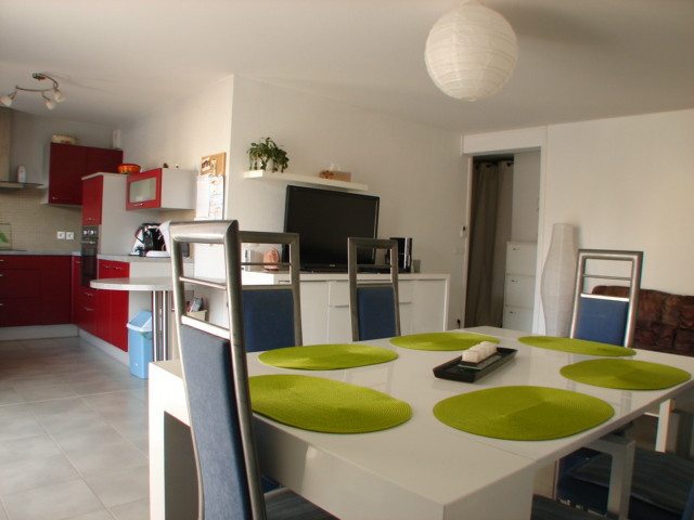 Puis au fond de l’appartement, sur le côté droit la partie « espace de vie » avec un grand salon-séjour ouvert sur une cuisine aux couleurs chaudes et donnant accès à un balcon très plaisant par son exposition sud-ouest.